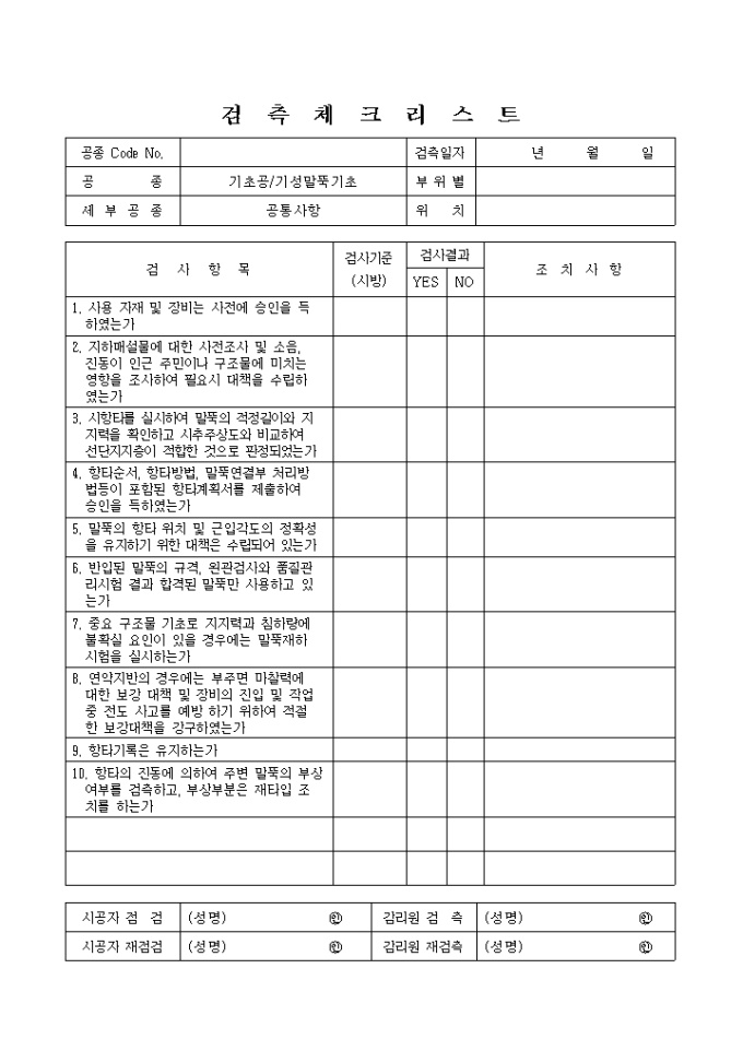 9,000원/월일반토목공사,기초공,기성말뚝기초-공통사항 검측체크리스트 입니다.
