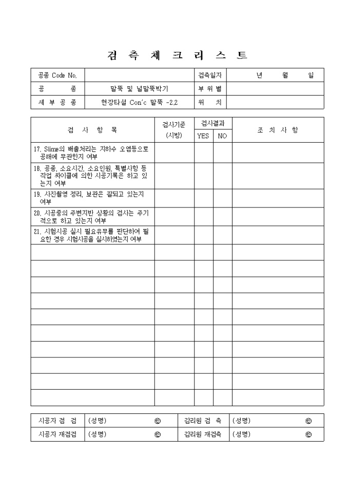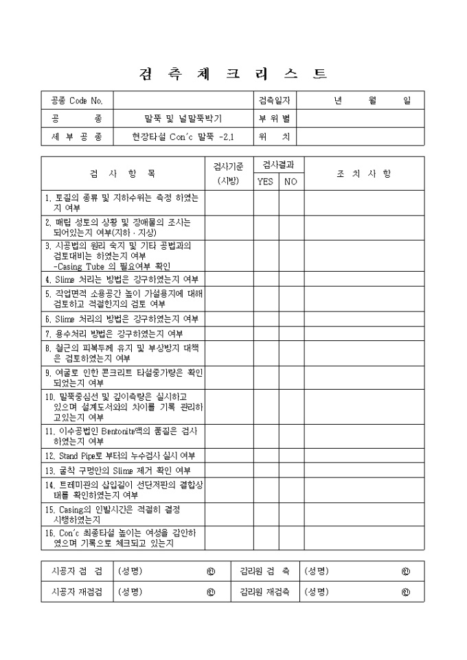 9,000원/월항만공사,현장타설Con"c말뚝 검측 체크 리스트입니다.