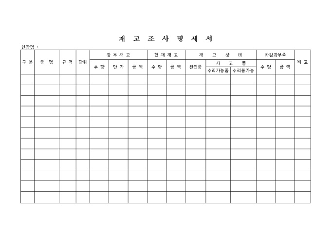 9,000원/월구분, 품명, 규격, 단우, 장부재교, 현재재고, 재고상태, 차감과부족으로 구성된 전기관련-재고조사명세서입니다.