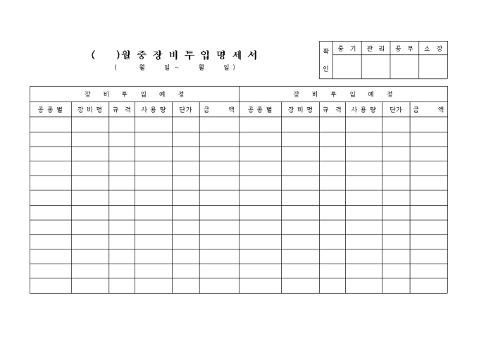 9,000원/월공종별,장비명,규격,사용량,단가,금액을 기록하는 전기관련-중장비투입명세서(월별)입니다.