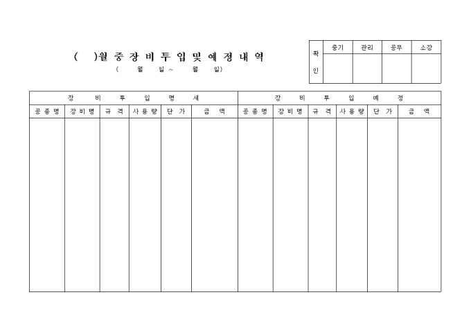 9,000원/월공종명,장비명,규격,사용량,단가,금액을 기록하는 전기관련-중장비투입및예정내역(월별)입니다.