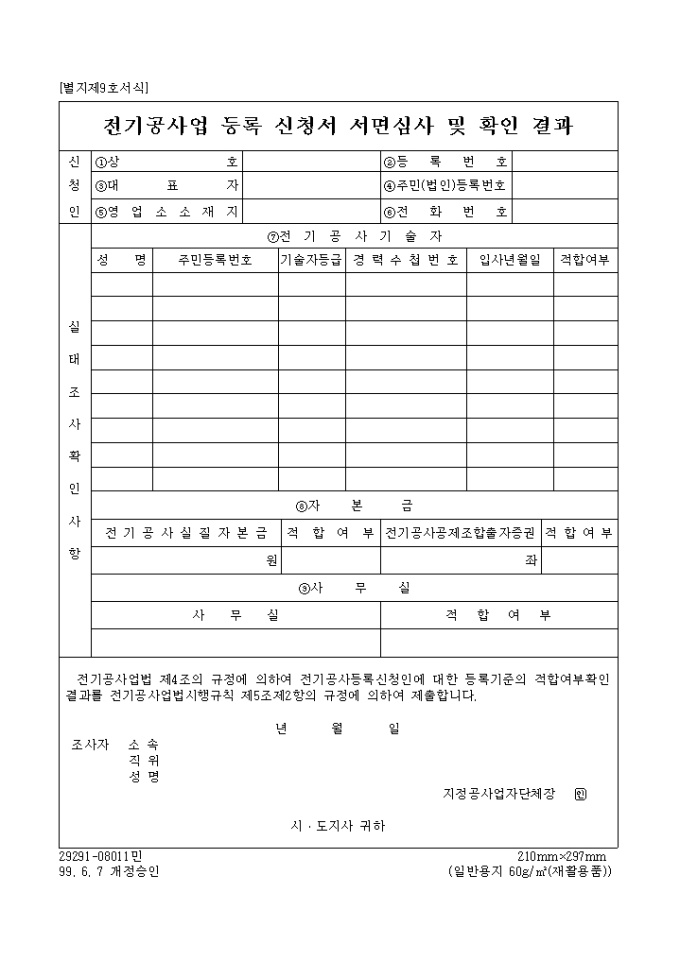 전기공사업법 제4조의 규정에 의하여 전기공사등록신청인에 대한 등록기준의 적합여부확인결과를 전기공사업법시행규칙 제5조제2항의 규정에 의하여 제출할 때 사용하는 양식입니다.