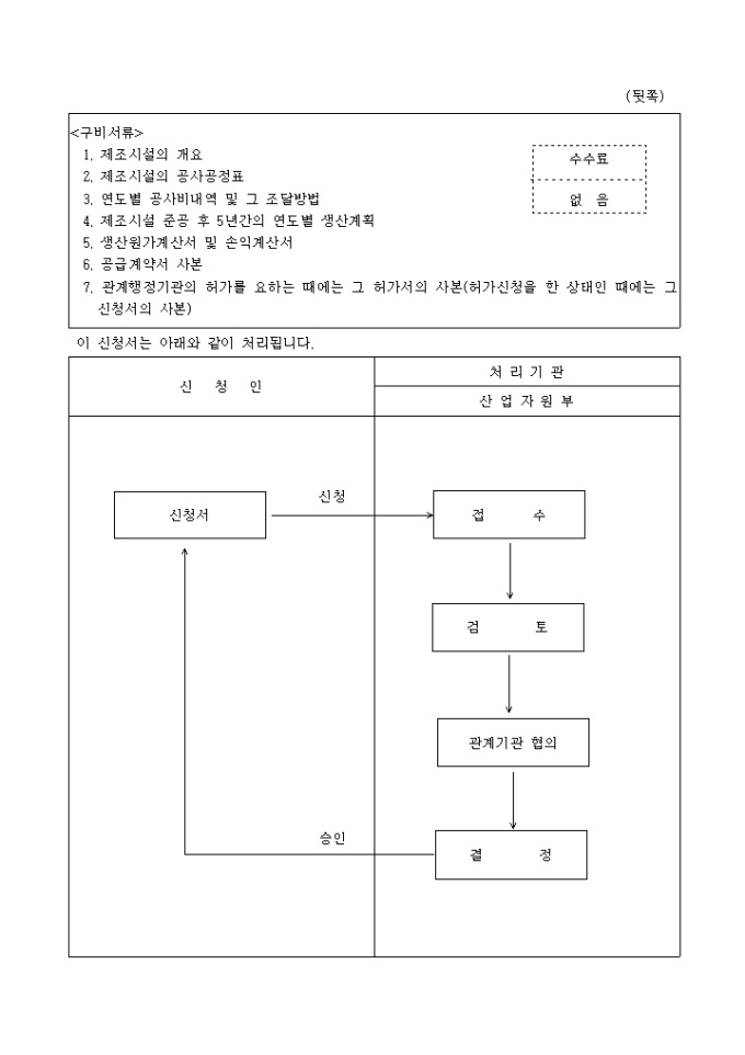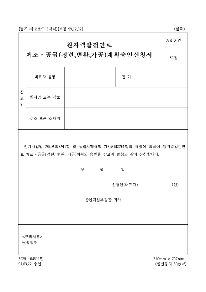 전기사업법 제4조의3제1항 및 동법시행규칙 제5조의2제1항의 규정에 의하여 원자력발전연료 제조 공급(정련, 변환, 가공)계획의 승인을 받고자 신청할 때 사용하는 양식입니다.