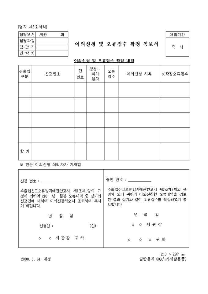 수출입신고오류방지에관한고시 제7조제1항의 규정에 의하여 200 년 월분 오류내역 중 상기의 신고건에 대하여 이의신청하오니 조치 의뢰 / 귀하가 이의신청한 오류내역을 검토한 결과 상기와 같이 오류점수를 확정하였기 통보받기 위한 양식입니다.