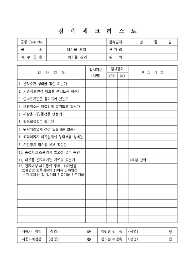 폐기물관리,폐기물오염 체크리스트 입니다.