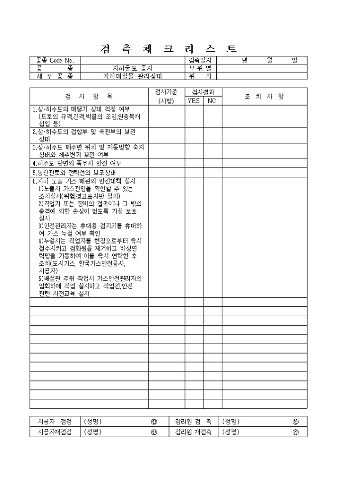 토목공사,지하굴토공사,지하매설물관리상태 체크리스트 입니다.