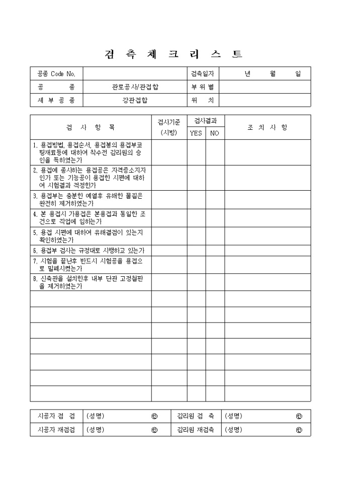 상하수도공사,관로공사-관접합,강관접합 검측 체크 리스트입니다. 검 사 항 목 1. 용접방법, 용접순서, 용접봉의 용접부코팅재료등에 대하여 착수전 감리원의 승인을 득하였는가 2. 용접에 종사하는 용접공은 자격증소지자 인가 또는 기능공이 용접한 시편에 대하여 시험결과 적정한가 ...................