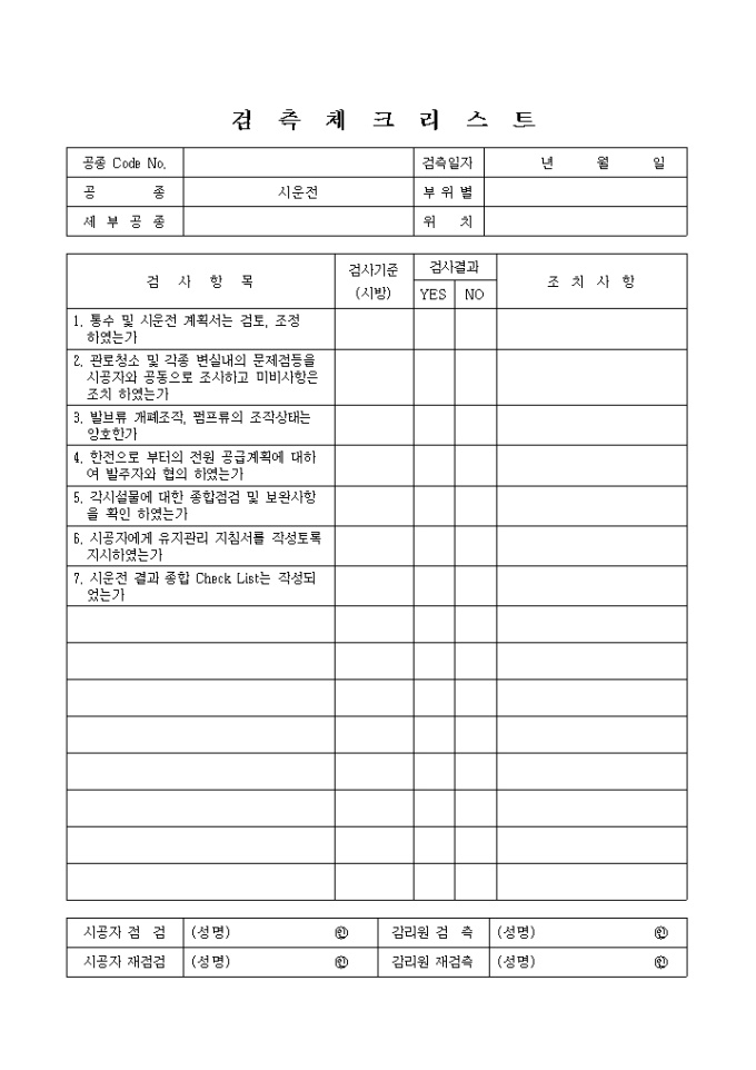 9,000원/월상하수도공사,시운전,시운전① 검측 체크 리스트입니다.