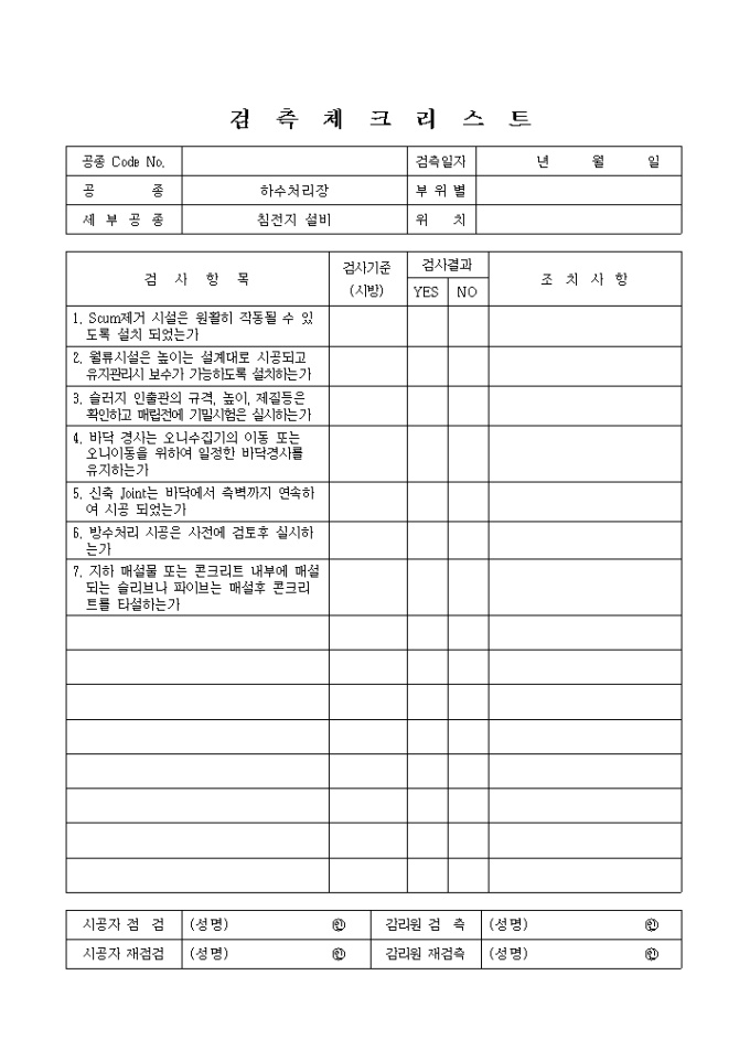 9,000원/월상하수도공사,하수처리장,침전지설비 검측 체크 리스트입니다.