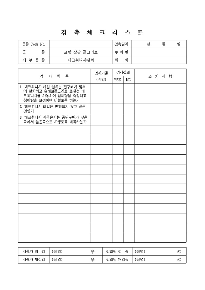 9,000원/월일반사항,교량상판콘크리트,데크휘니샤설치 검측체크 리스트입니다.