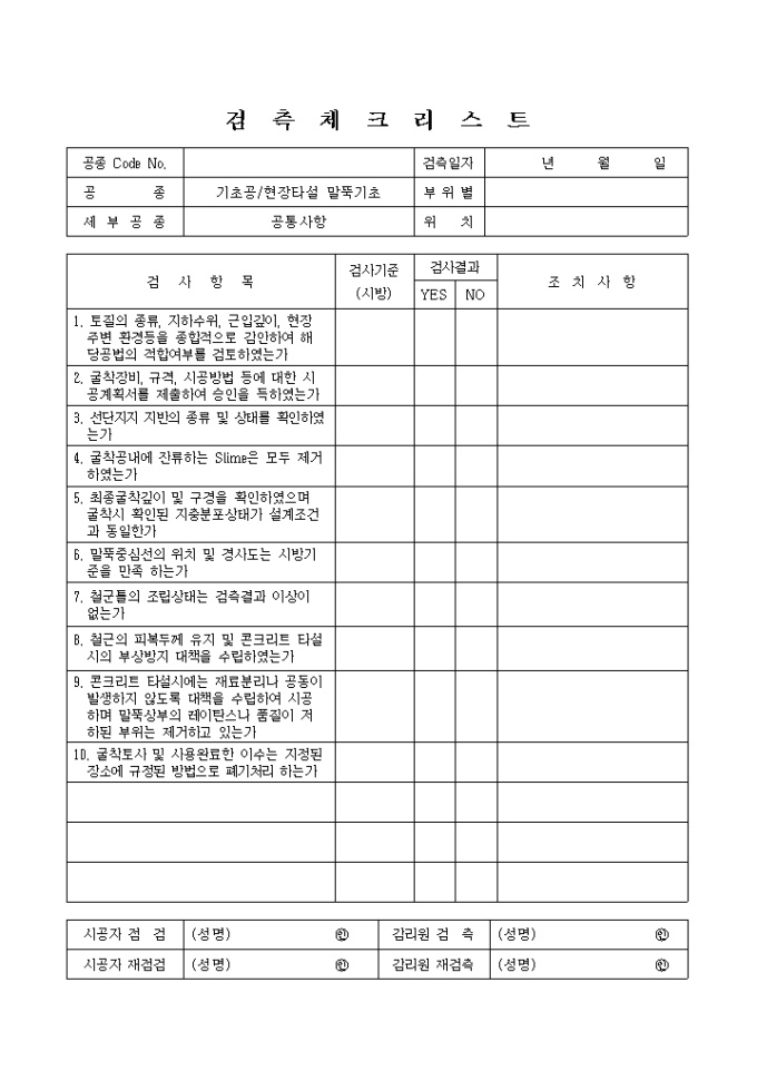 일반토목공사,기초공,현장타설말뚝기초-공통사항 검측 체크 리스트입니다.