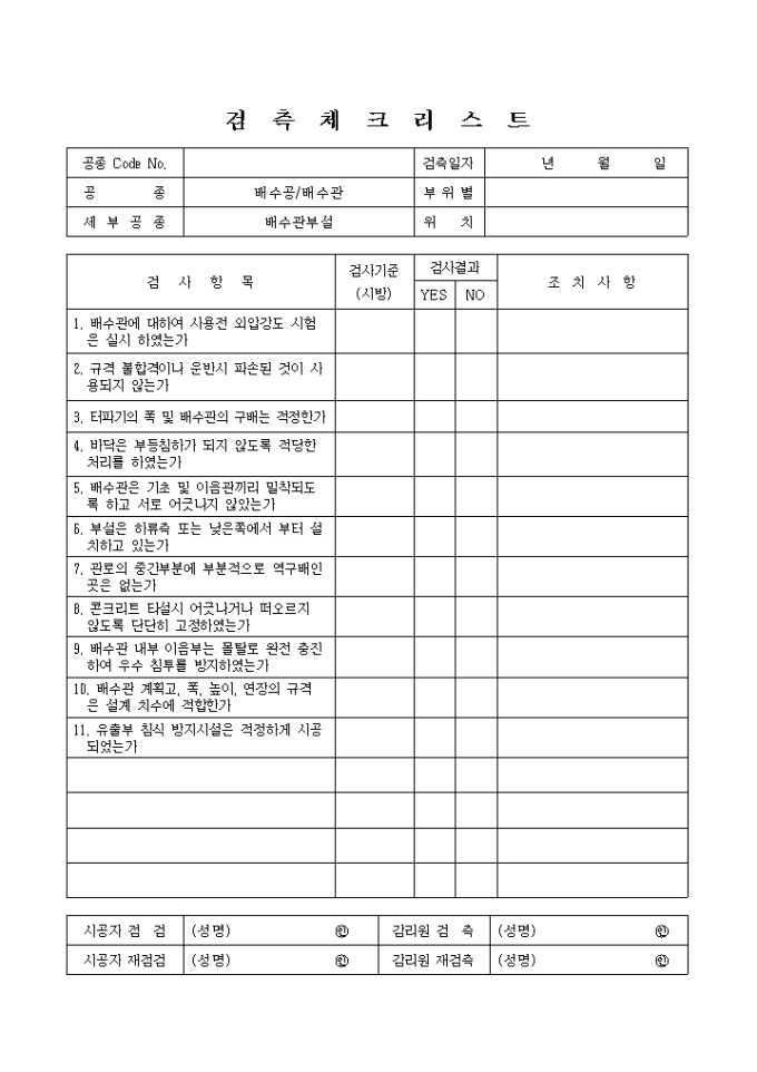 9,000원/월일반토목공사,배수공사,배수관-배수관부설 검측 체크리스트입니다.
