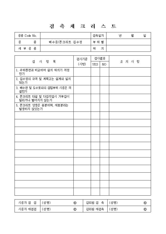 9,000원/월일반토목공사,배수공사,콘크리트집수정 검측 체크 리스트입니다.