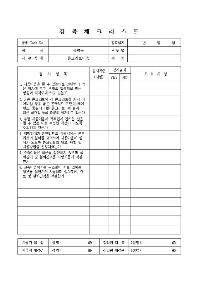 9,000원/월일반토목공사,옹벽공,콘크리트이음 검측 체크 리스트입니다.