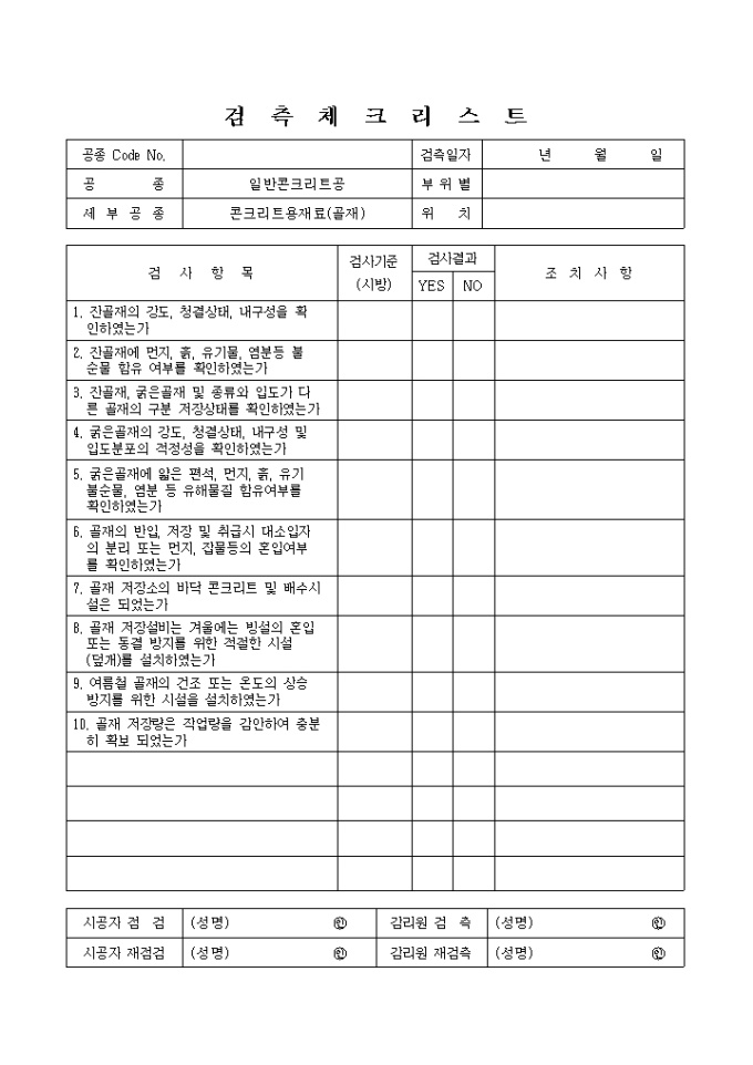 일반토목공사,일반콘크리트공,콘크리트용재료(골재) 검측 체크 리스트입니다.