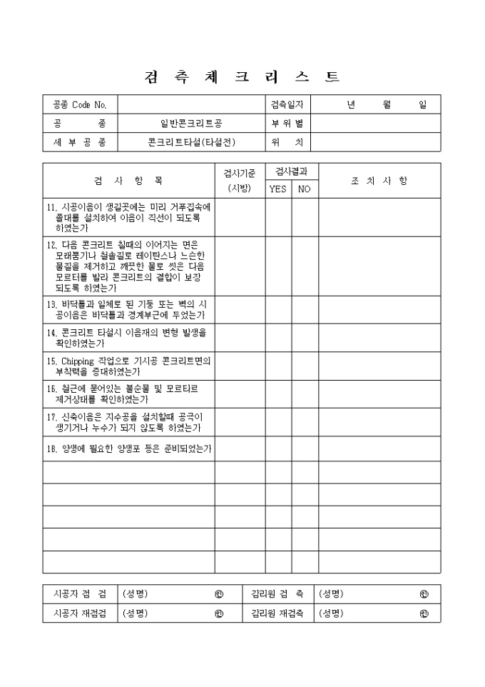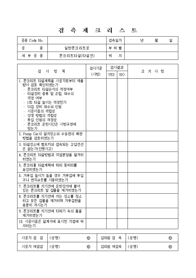 일반토목공사,일반콘크리트공,콘크리트타설(전) 검측 레츠 리스트입니다.