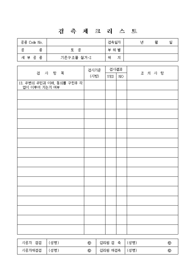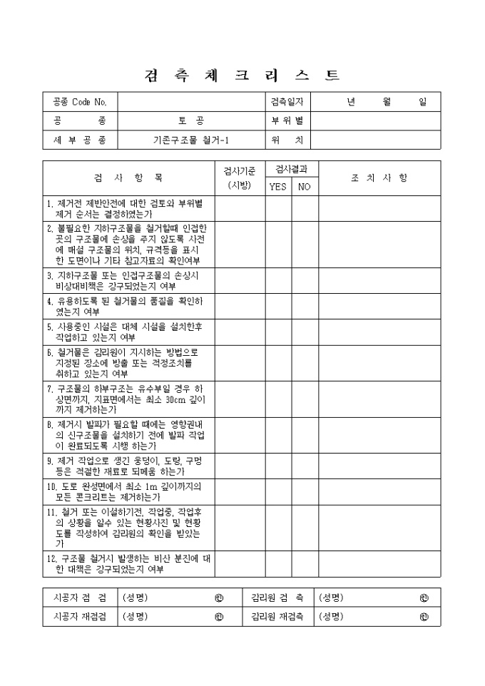 일반토목공사,토공,기존구조물철거 검측 체크 리스트입니다.