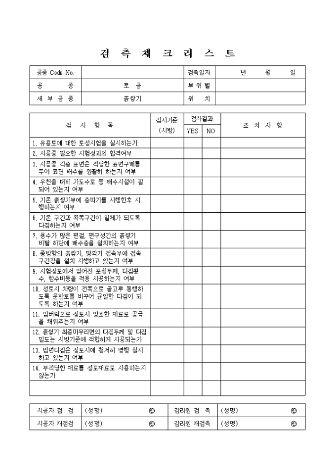 9,000원/월일반토목공사,토공,흙쌓기① 검측 체크 리스트입니다.