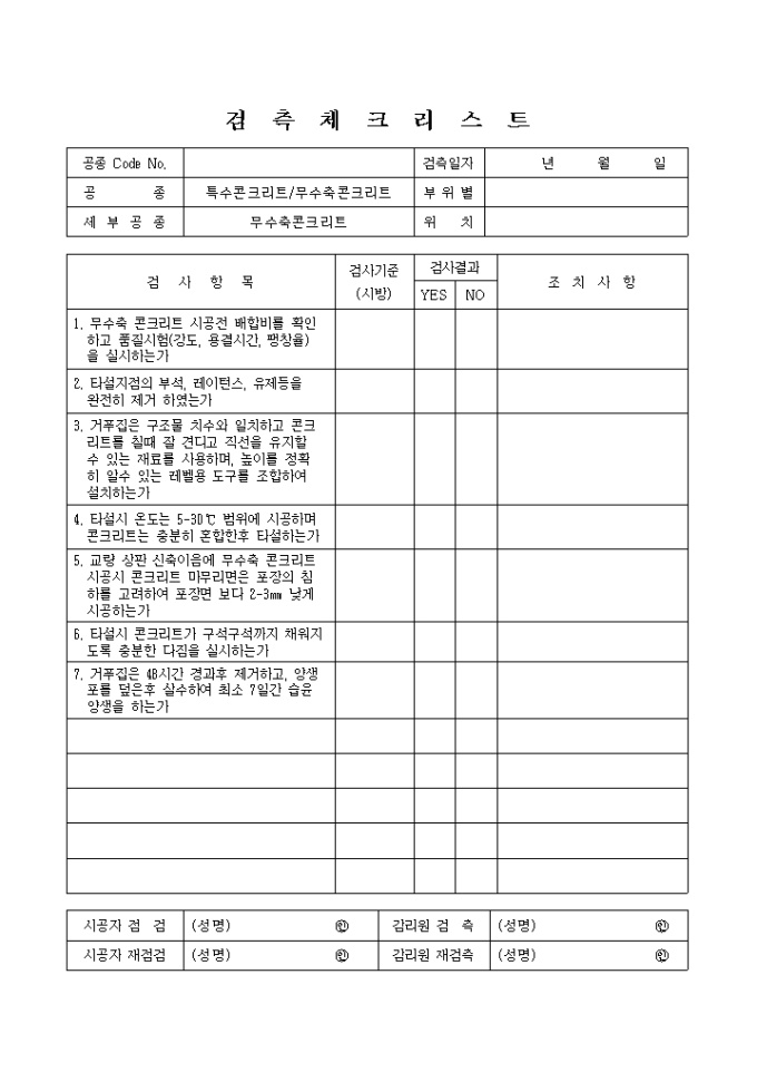 9,000원/월일반토목공사,특수콘크리트공,무수축콘크리트 검측 체크 리스트입니다.