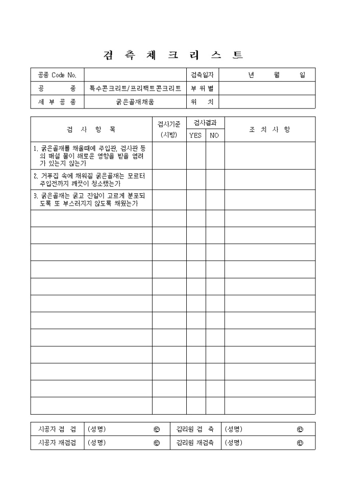 일반토목공사,특수콘크리트공,프리팩트콘크리트-굻은골재채움 검측 체크 리스트입니다.