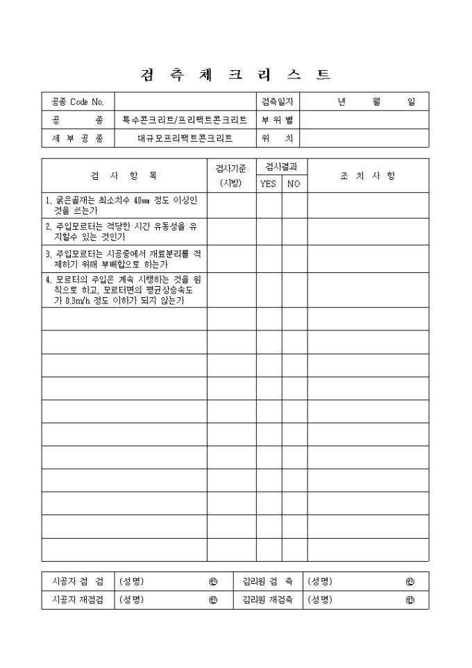 9,000원/월일반토목공사,특수콘크리트공,프리팩트콘크리트-대규모프리팩트콘크리트 검측 체크 리스트입니다.