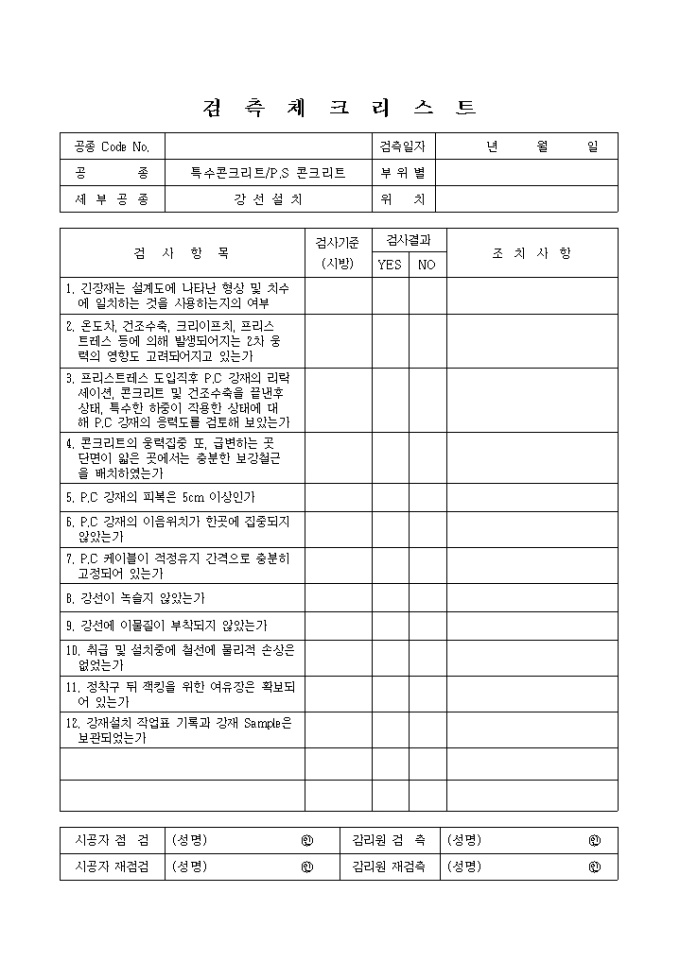 일반토목공사,특수콘크리트공,P.S콘크리트-강선설치 검측 체크 리스트입니다.