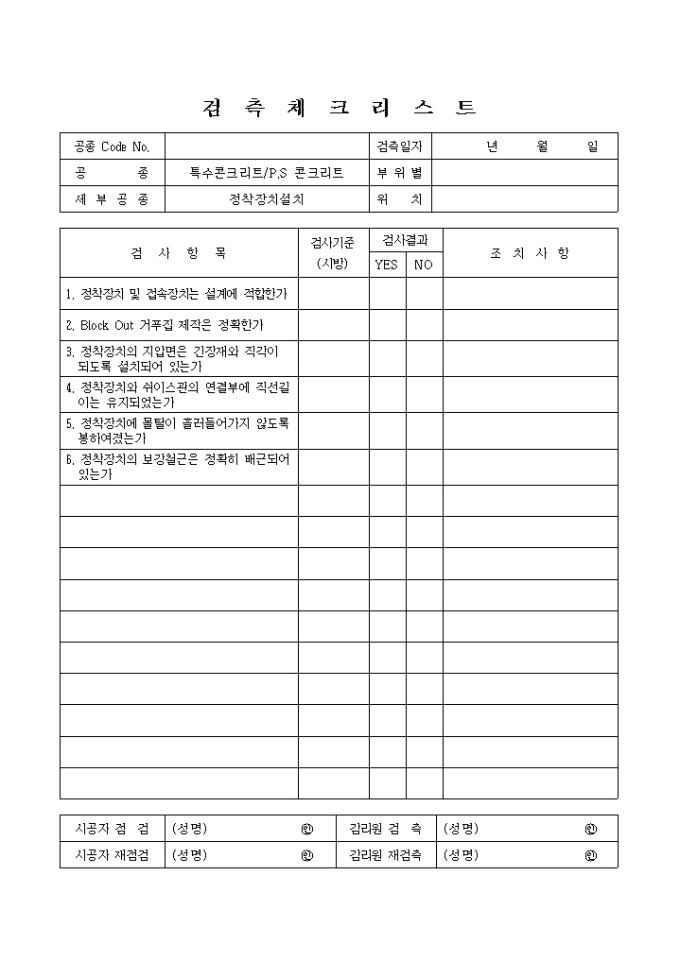 9,000원/월일반토목공사,특수콘크리트공,P.S콘크리트-정착장치설치 검측체크 리스트입니다.