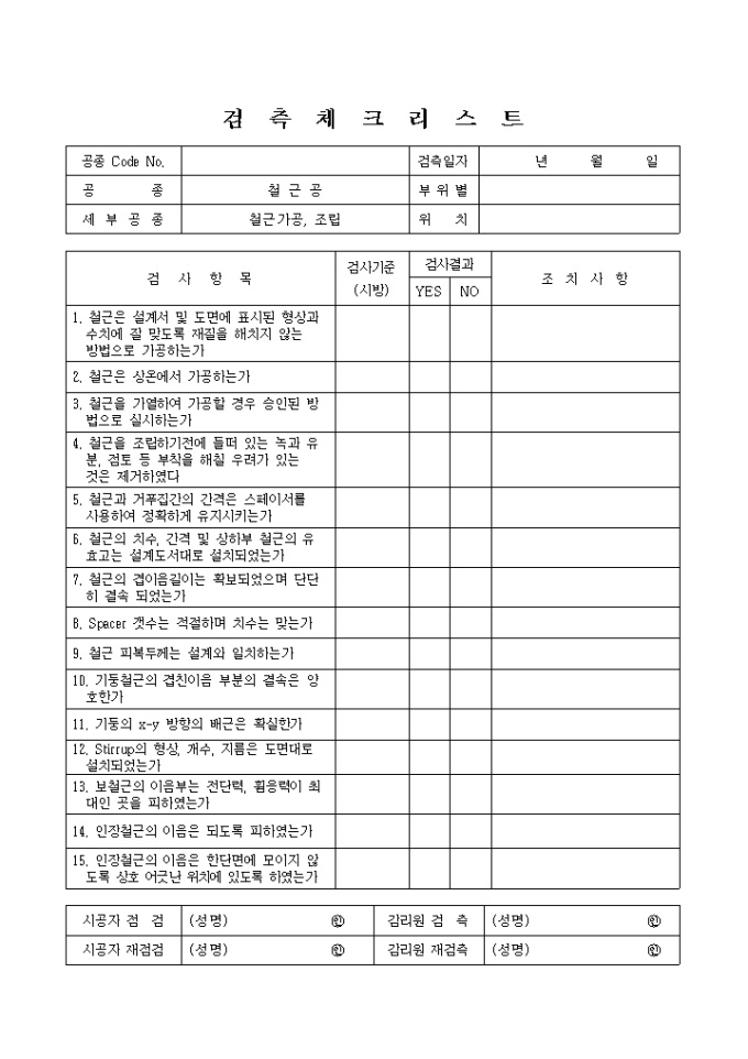 철근공,철근가공조립 검측 체크 리스트입니다.