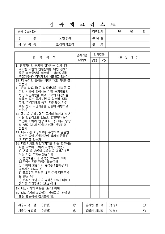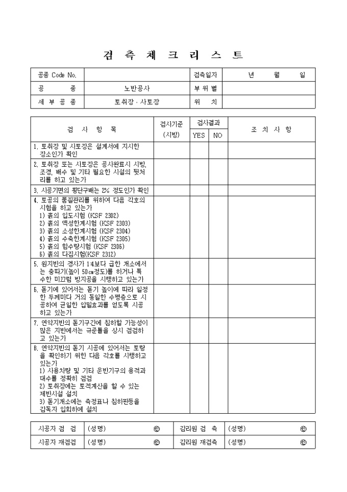 철도및지하철공사,노반공사,토취장사토장 검측 체크 리스트입니다.