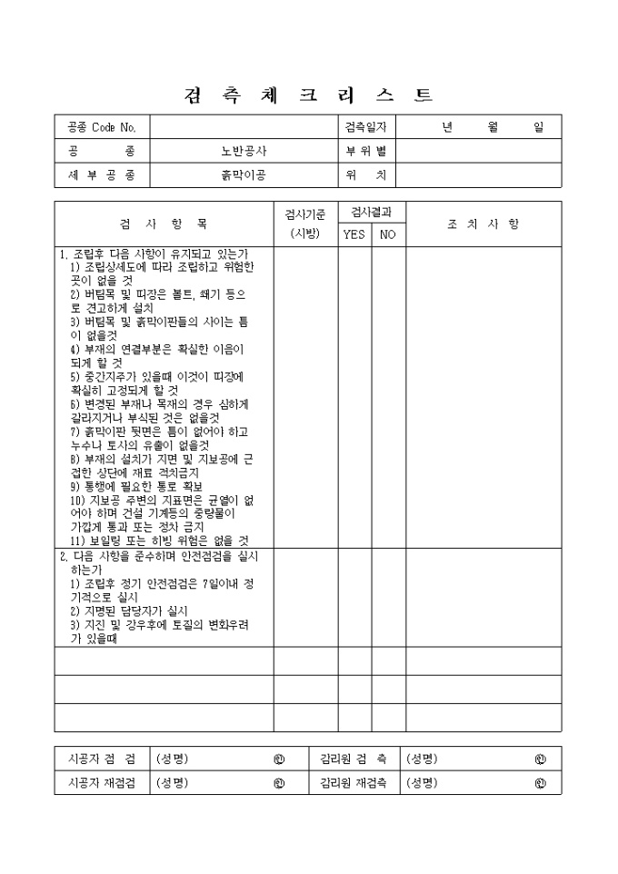 철도및지하철공사,노반공사,흙막이공 검측 체크 리스트입니다.