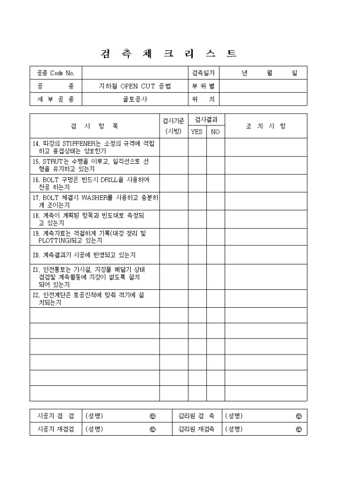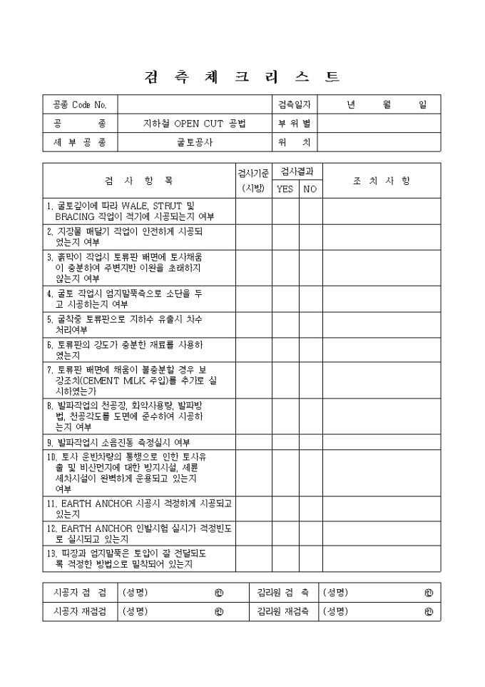 9,000원/월철도및지하철공사,지하철OPENCUT공법,굴토공사 검측 체크 리스트입니다.