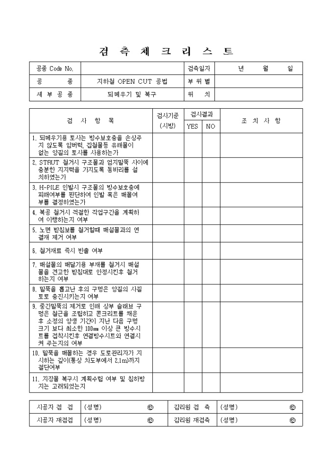 9,000원/월철도및지하철공사,지하철OPENCUT공법,되메우기및복구 검측 체크 리스트입니다. 검 사 항 목 1. 되메우기용 토사는 방수보호충을 손상주지 않도록 암버럭, 잡철물등 유해물이 없는 양질의 토사를 사용하는가 2. STRUT 철거시 구조물과 엄지말뚝 사이에 충분한 지지력을 가지도록 동바리를 설치하였는가 ..............
