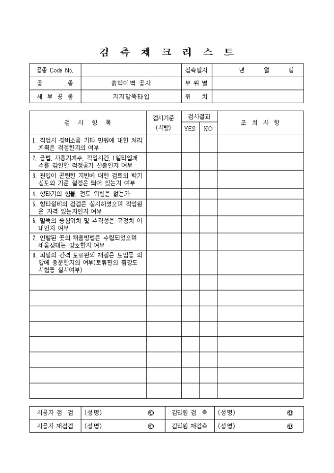 9,000원/월철도및지하철공사,흙막이법공사,지지말뚝타입 검측 체크 리스트입니다.