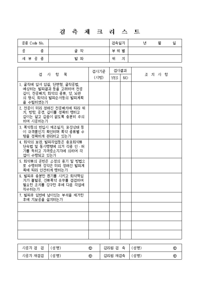 터널공사,굴착,발파① 검측 체크 리스트입니다.
