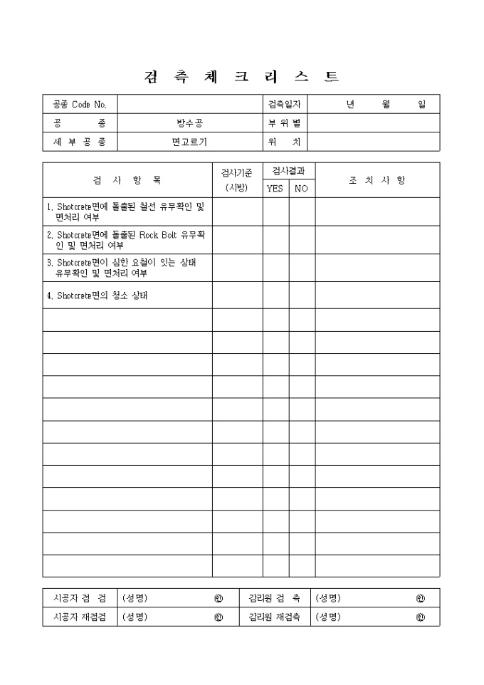 터널공사,방수공,면고르기 검측 체크 리스트입니다.