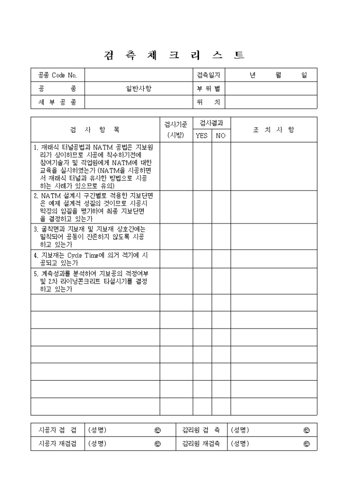 터널공사, 일반사항 검측 체크리스트