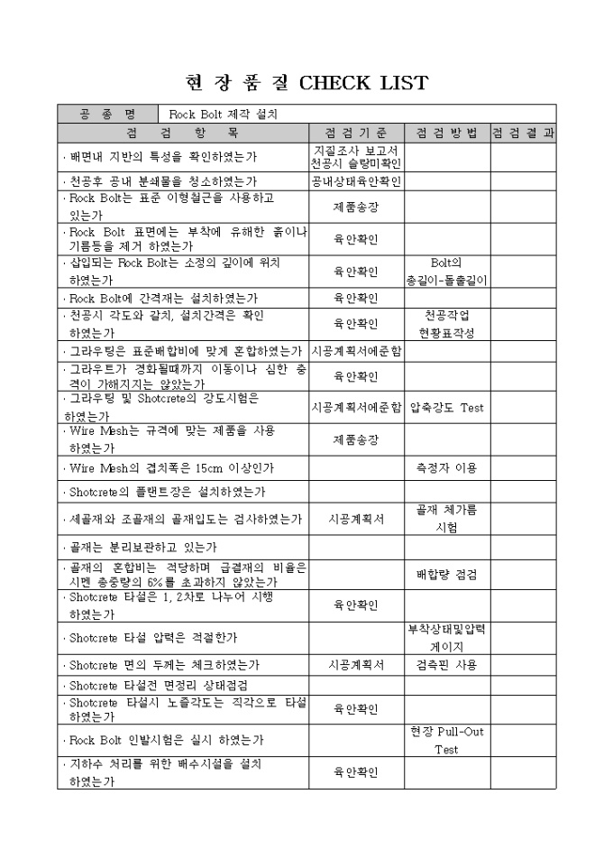 터널공사,지보공,RockBolt제작설치 검측 체크 리스트입니다.