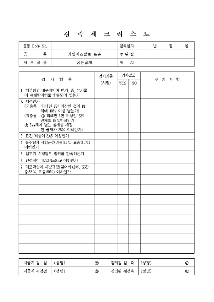 포장공사,가열아스팔트표층,굵은골재 검측 체크 리스트입니다.