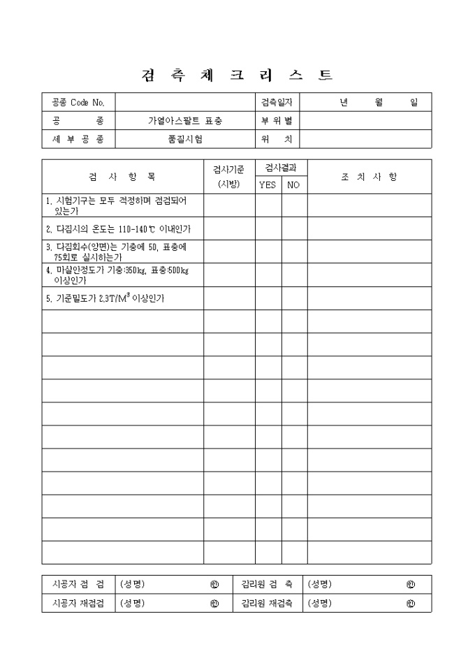 9,000원/월포장공사,가열아스팔트표층,품질시험 검측 체크 리스트입니다.
