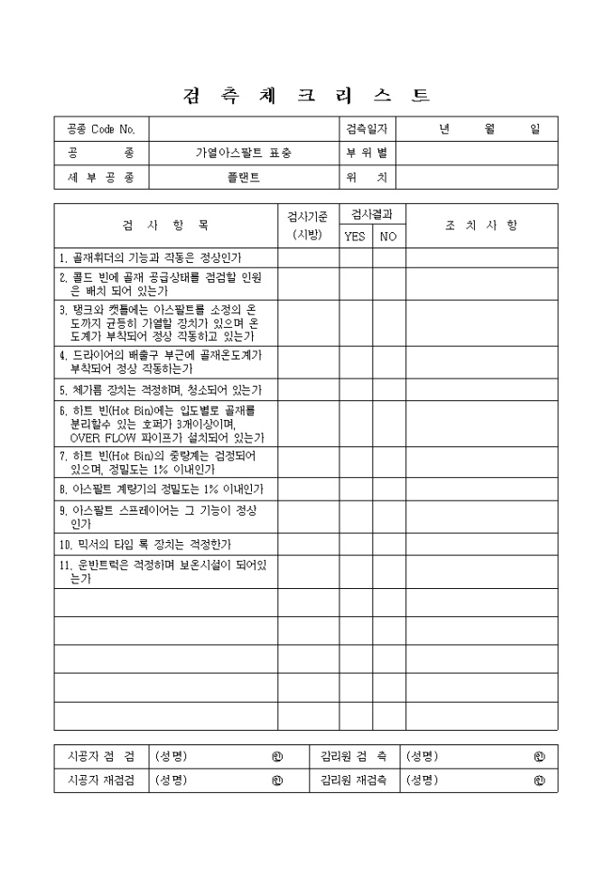 포장공사,가열아스팔트표층,플랜트 검측 체크 리스트입니다.