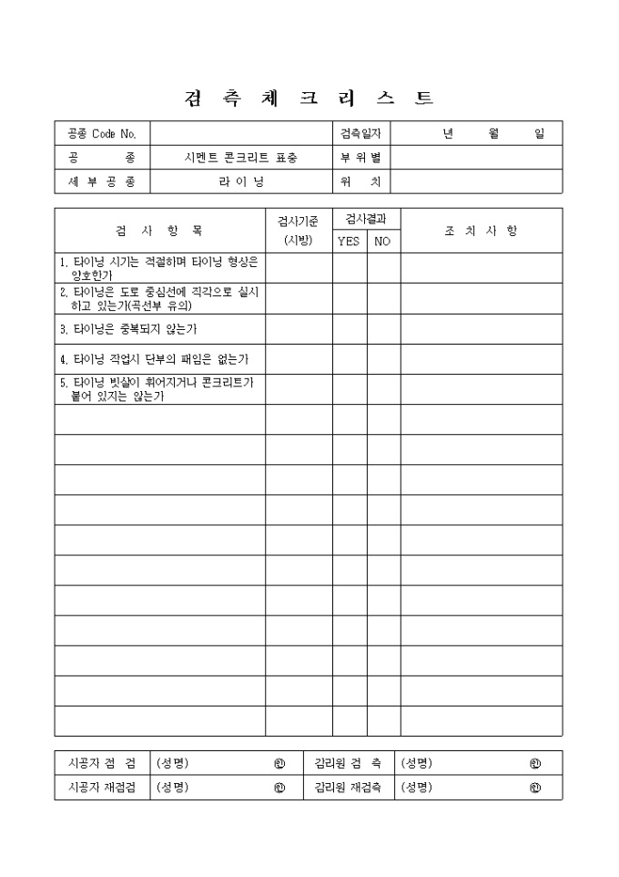 포장공사,시멘트콘크리트표층,라이닝① 검측 체크 리스트입니다.
