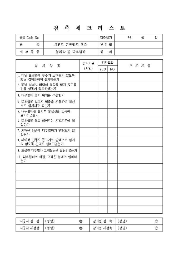 포장공사,시멘트콘크리트표층,분리막및다우웰바 검측체크리스트입니다.