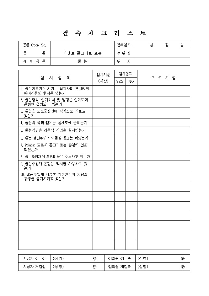 포장공사,시멘트콘크리트표층,줄눈 검측 체크 리스트입니다.