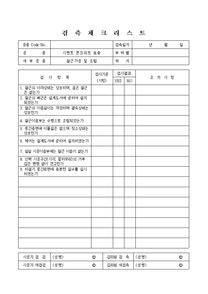 포장공사,시멘트콘크리트표층,철근가공및조립 검측 체크 리스트입니다.