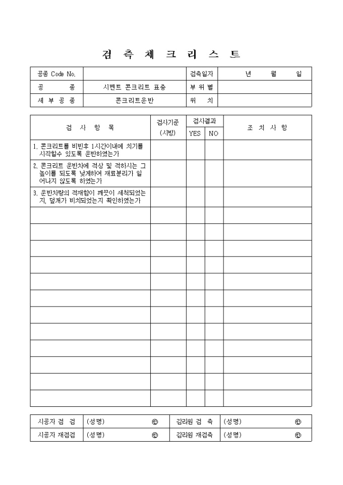 포장공사,시멘트콘크리트표층,콘크리트운반 검측 체크 리스트입니다.