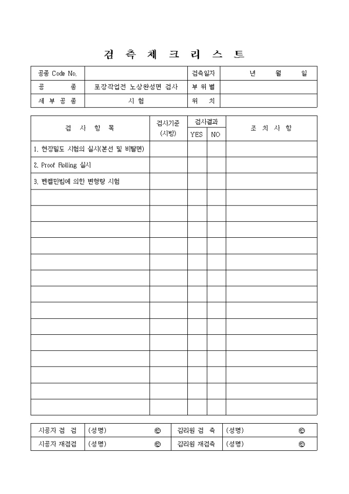 9,000원/월포장공사,포장작업전노상완성면공사,시험② 검측 체크 리스트입니다.