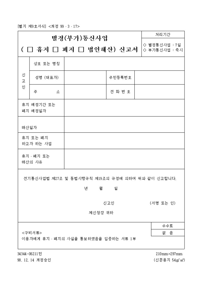 별정(부가)통신사업(휴지, 폐지, 법인해산)신고서