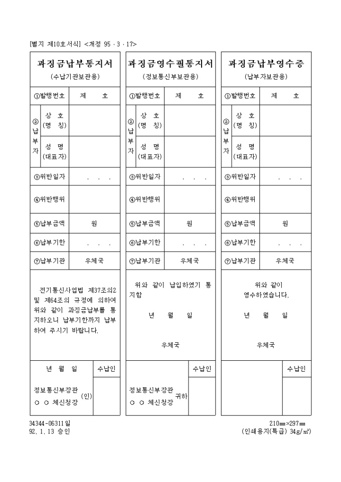 전기통신사업법 제37조의2 및 제64조의 규정에 의하여 과징금납부를 통지할 때 사용하는 양식입니다.