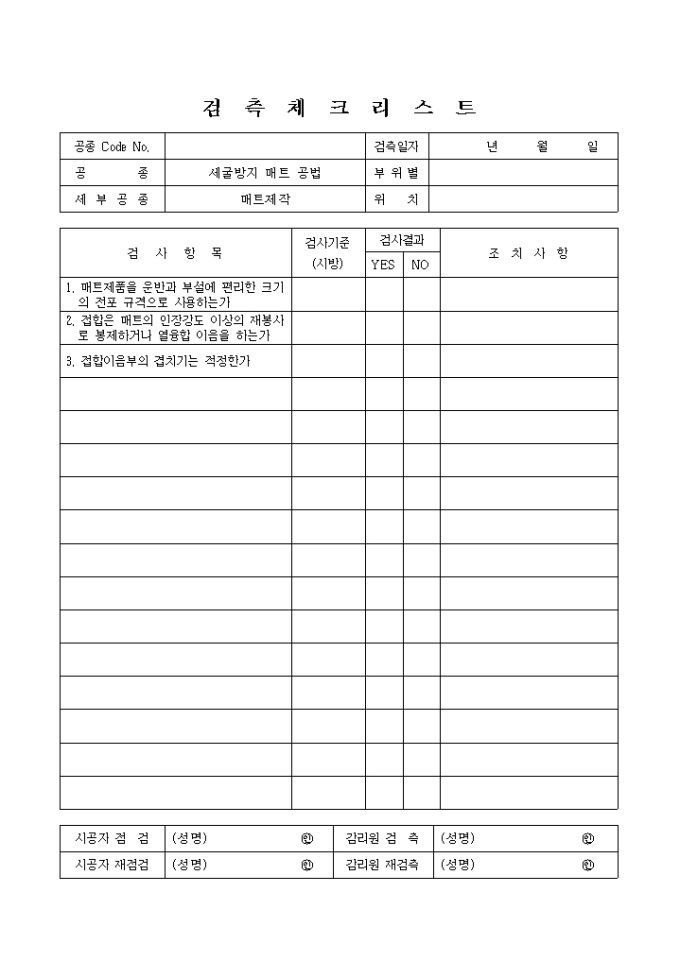 항만공사,매트제작 검측 체크 리스트입니다.