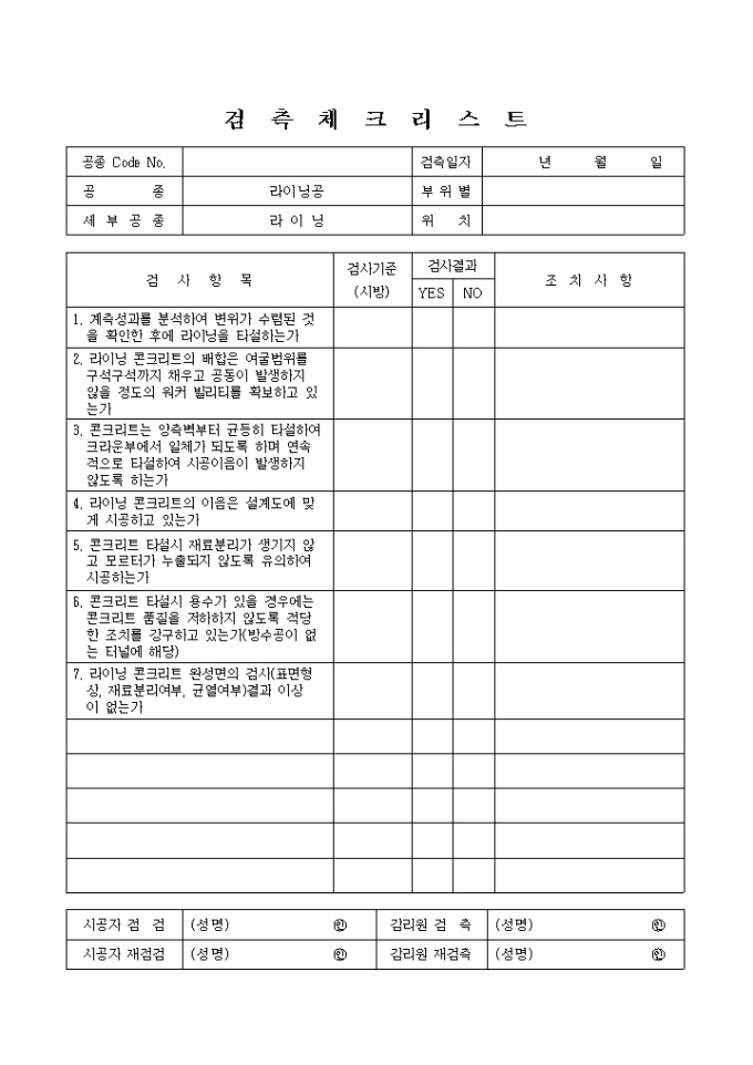 터널공사,라이닝공,라이닝② 검측 체크 리스트입니다.
